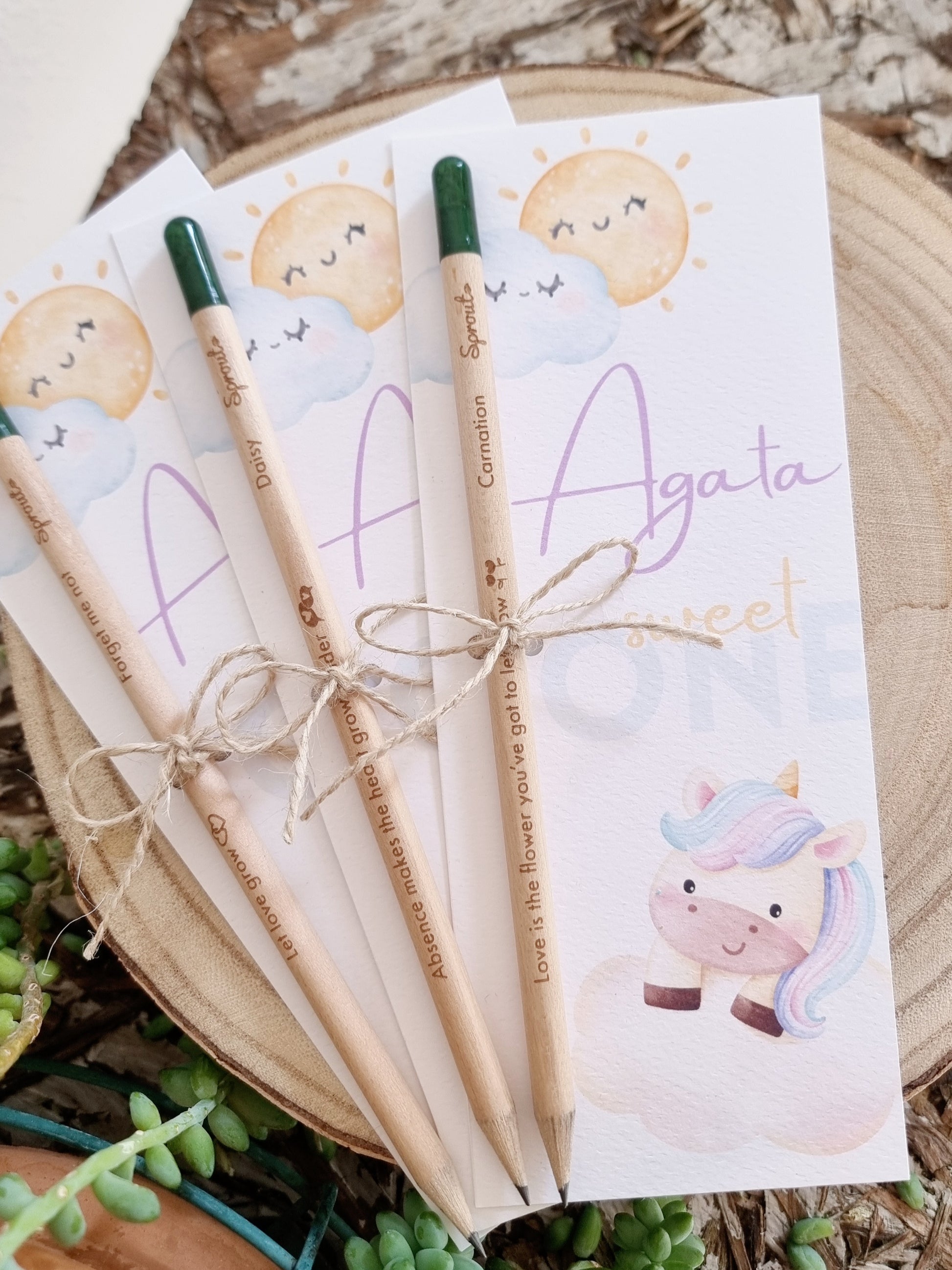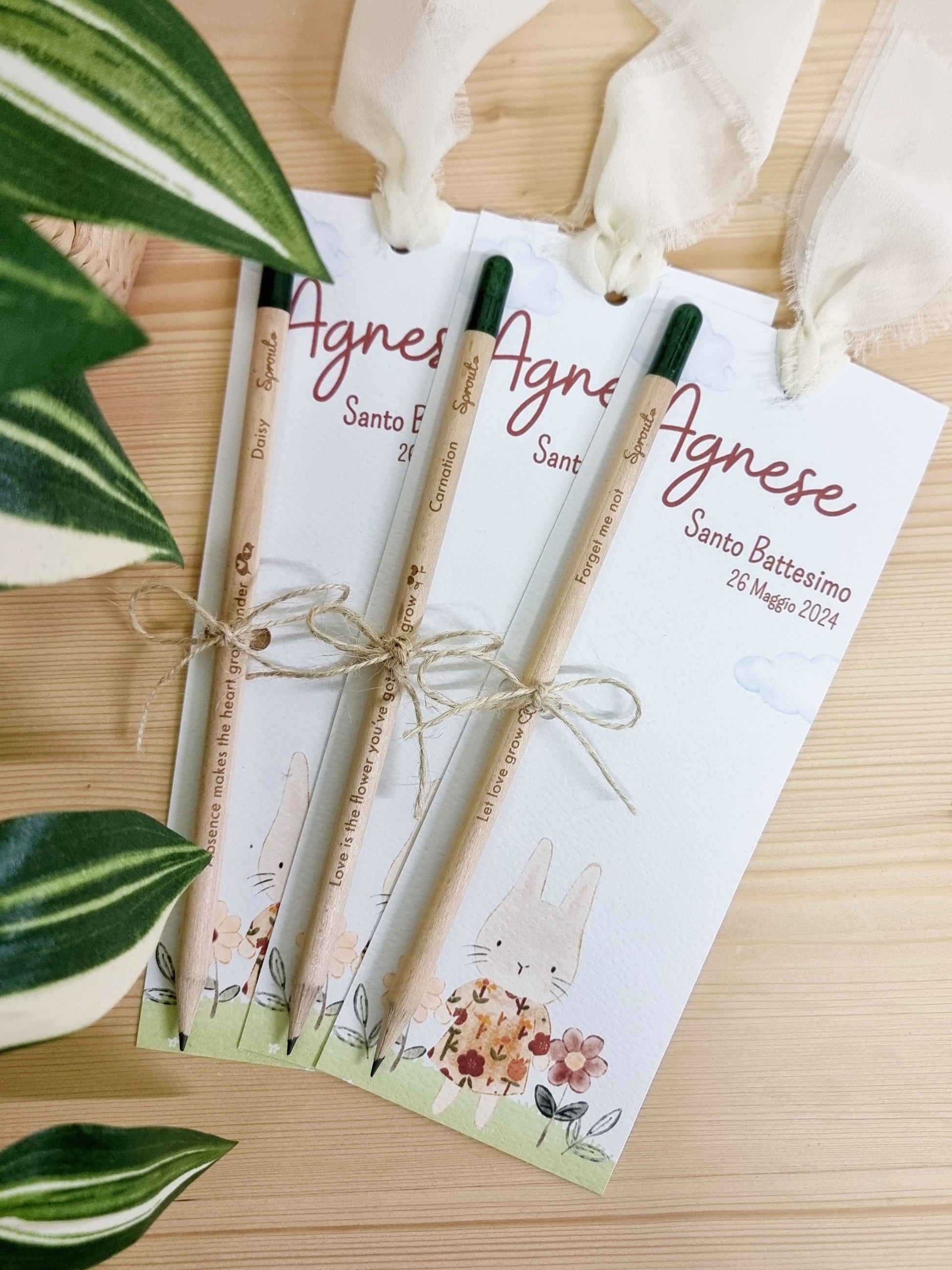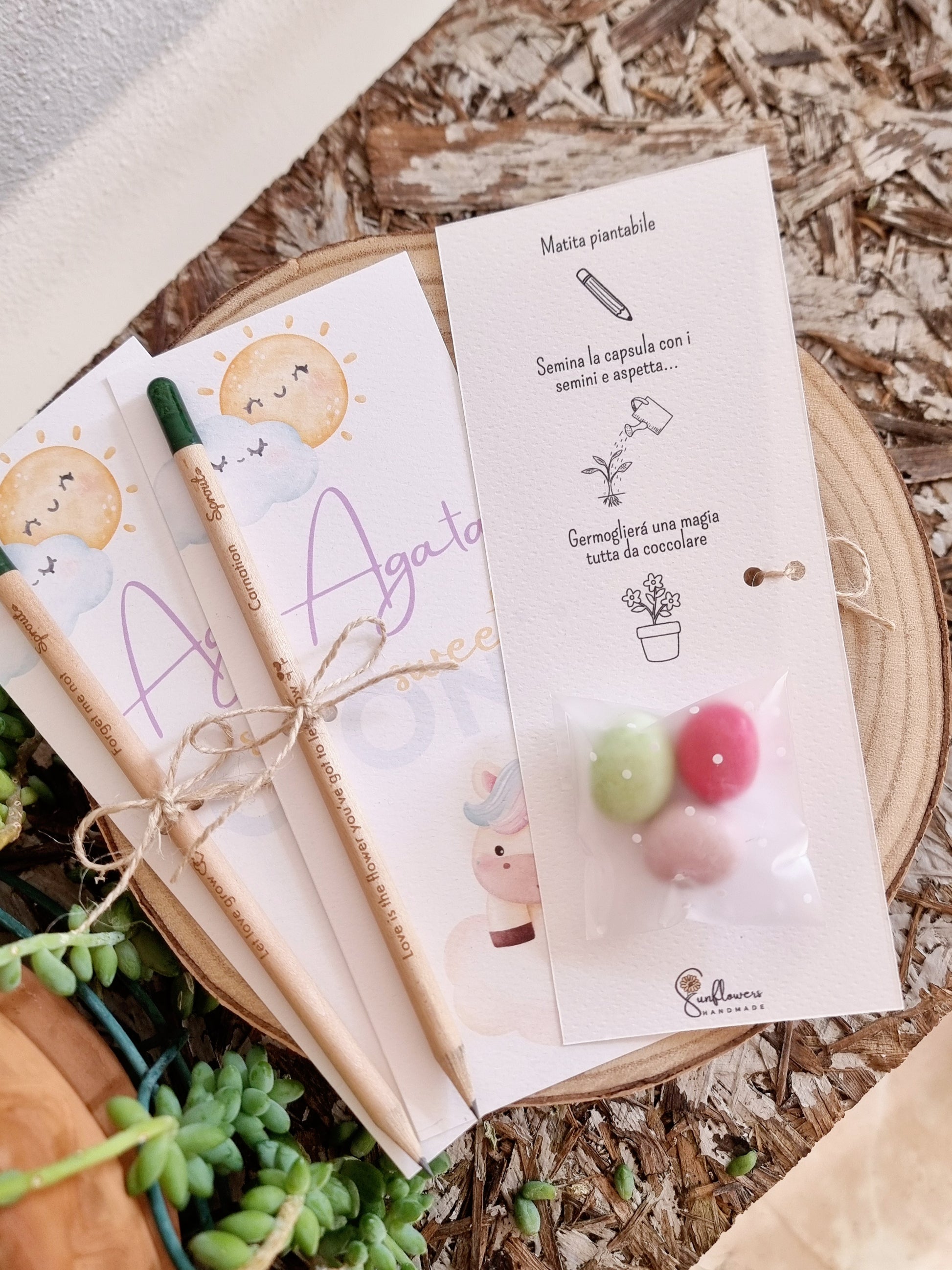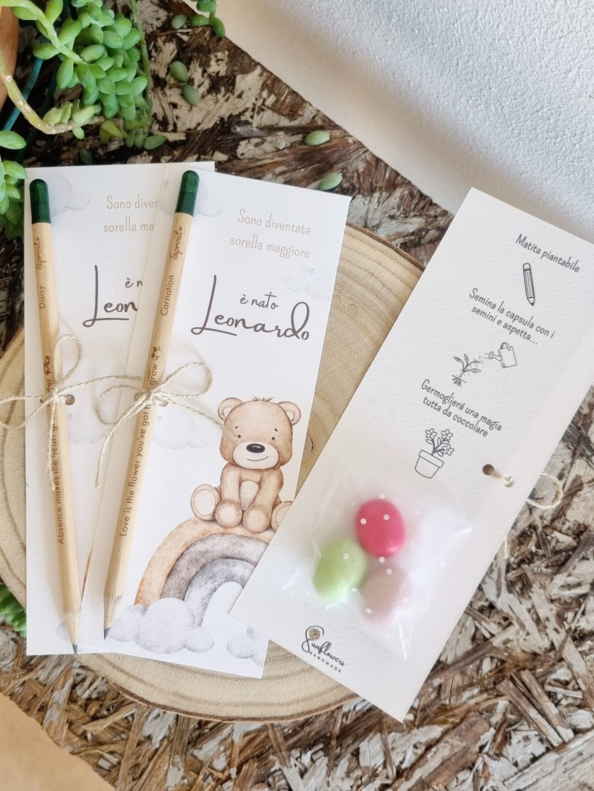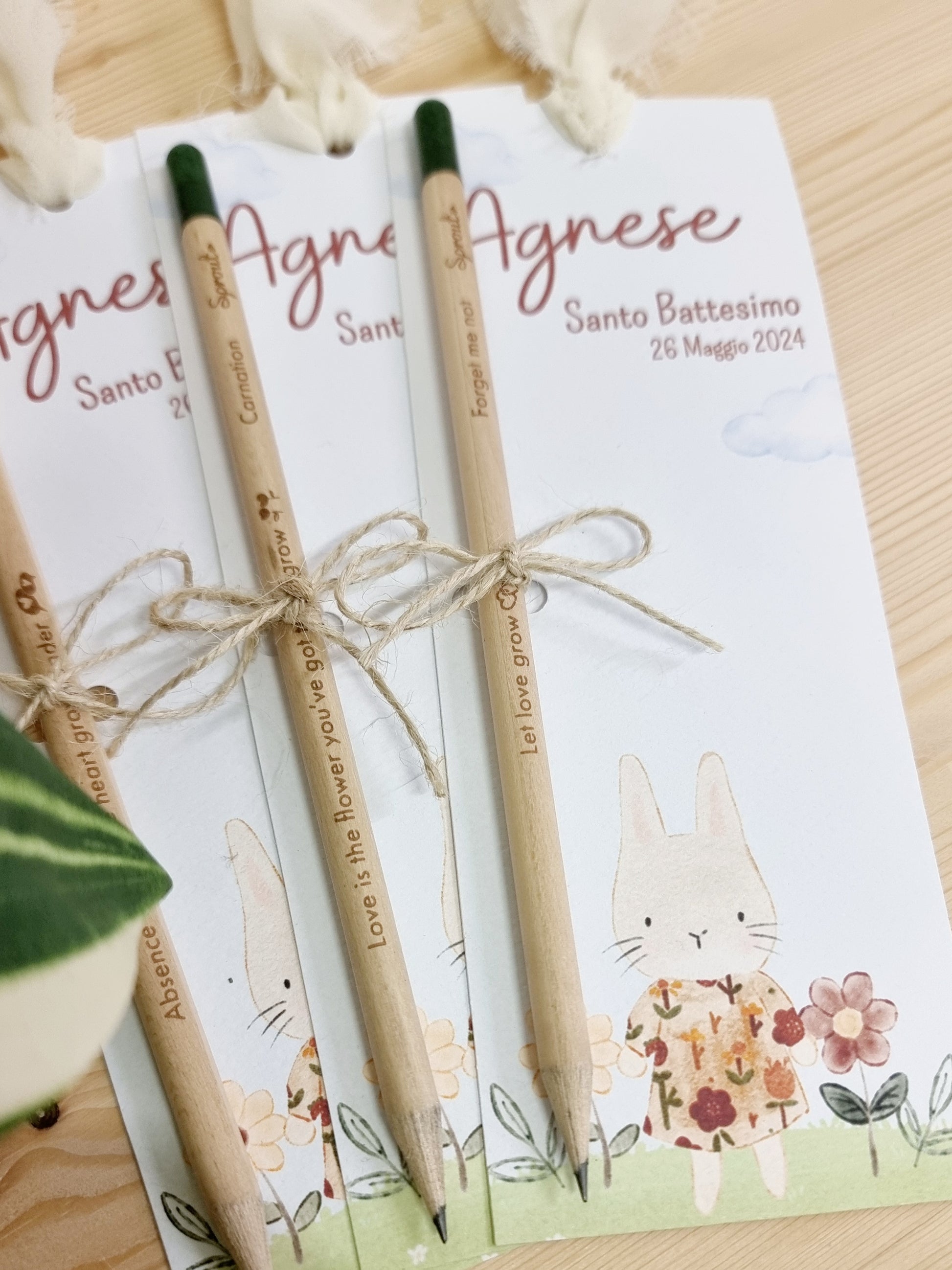 Il segnalibro è fronte-retro, nella parte davanti verrà inserita la grafica e la matita piantabile con semi misti, mentre nel retro i confetti all'interno di una bustina idonea.